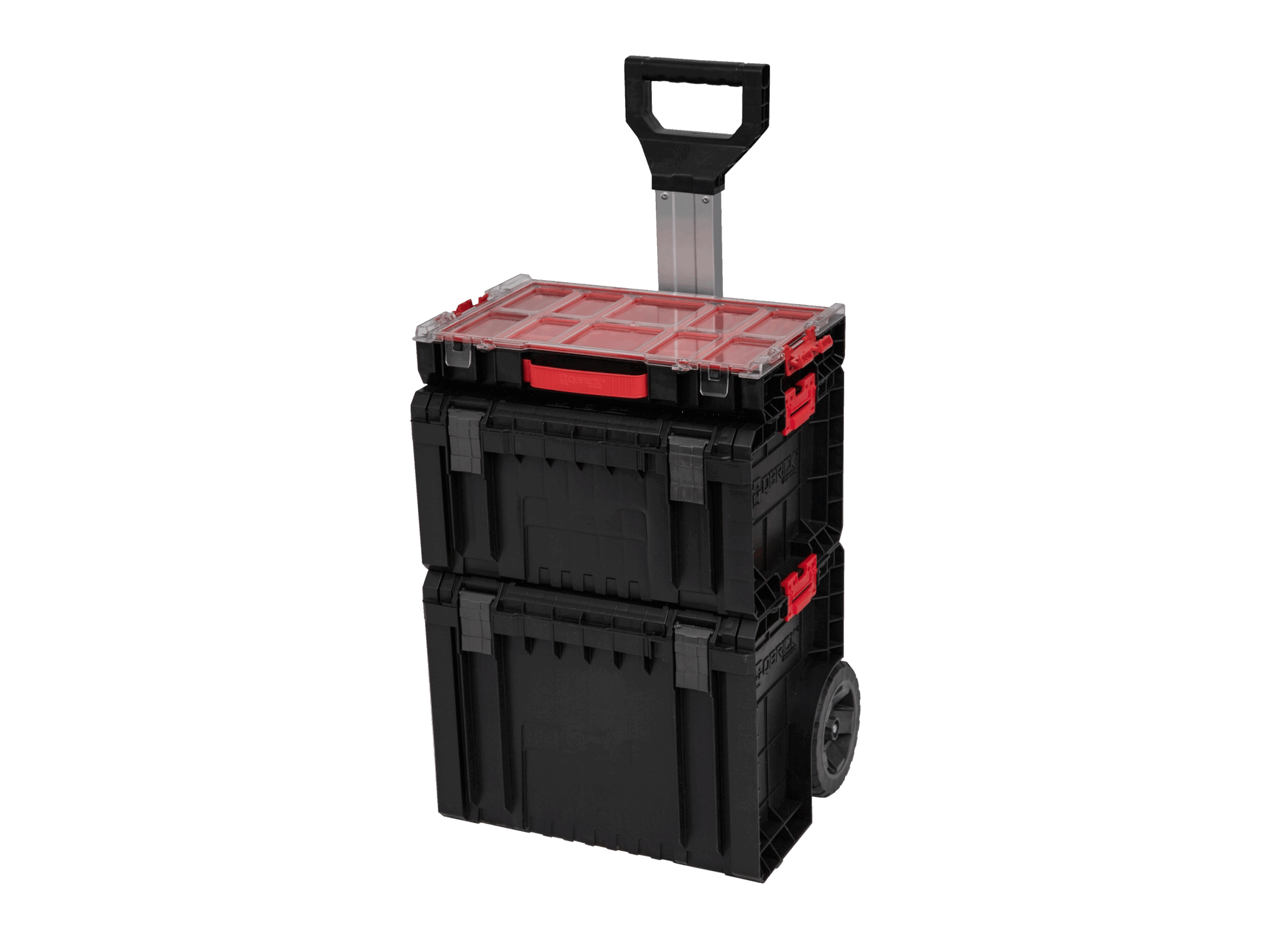 QS PRO Set ist ein dreiteiliges Set bestehend aus: QS PRO Cart – eine mobile Werkzeug-Wagon mit Teleskopgriff QS PRO Toolbox ausgestattet mit 3 Fächern und einem Tablett QS PRO Organizer 100 mit 8 Behältern in verschiedenen Größen Das PRO-System richtet sich sowohl an Heimwerker als auch an Profis Verstärkte Struktur und langlebige Seitenverbinder aus Polyamid und Polyamidverschlüsse Trennwände zur Selbstorganisation des Platzes im Inneren der Toolbox Modulare Werkzeugboxen – stapel- und kombinierbar Im praktischen Organizer 100 lassen sich Kleinteile und Werkstattzubehör aufbewahren Abdecklung des Organizer 100 aus transparentem Polycarbonat mit hoher Beständigkeit gegen mechanische Beschädigungen und bester Übersicht Mit dem soliden Teleskopgriff und den zwei großen Räder; die auf einer Metallachse montiert sind, lässt sich der Werkstattwagen problemlos transportieren Material Polyamid, Polycarbonat, Metall Maße ca. L 45 x B 39 x H 69 cm Gewicht ca. 9,1 kg