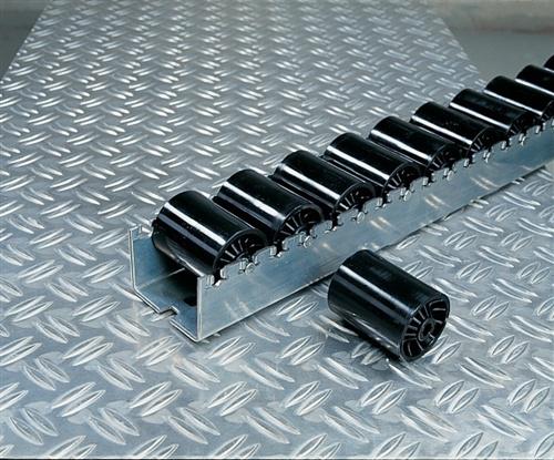 Rollenleiste schwer L.3600mm Ku.-Zylinderrollen D.46mm Rollenteilung 48mm · für den Transport von Paletten · Tragfähigkeit bei Bodenauflage max. 600 kg/m · Kunststoff-Zylinderrollen, Ø 46 mm, schwarz Gleitlager · Rollenträgerprofil verzinkt, H 67,0 x