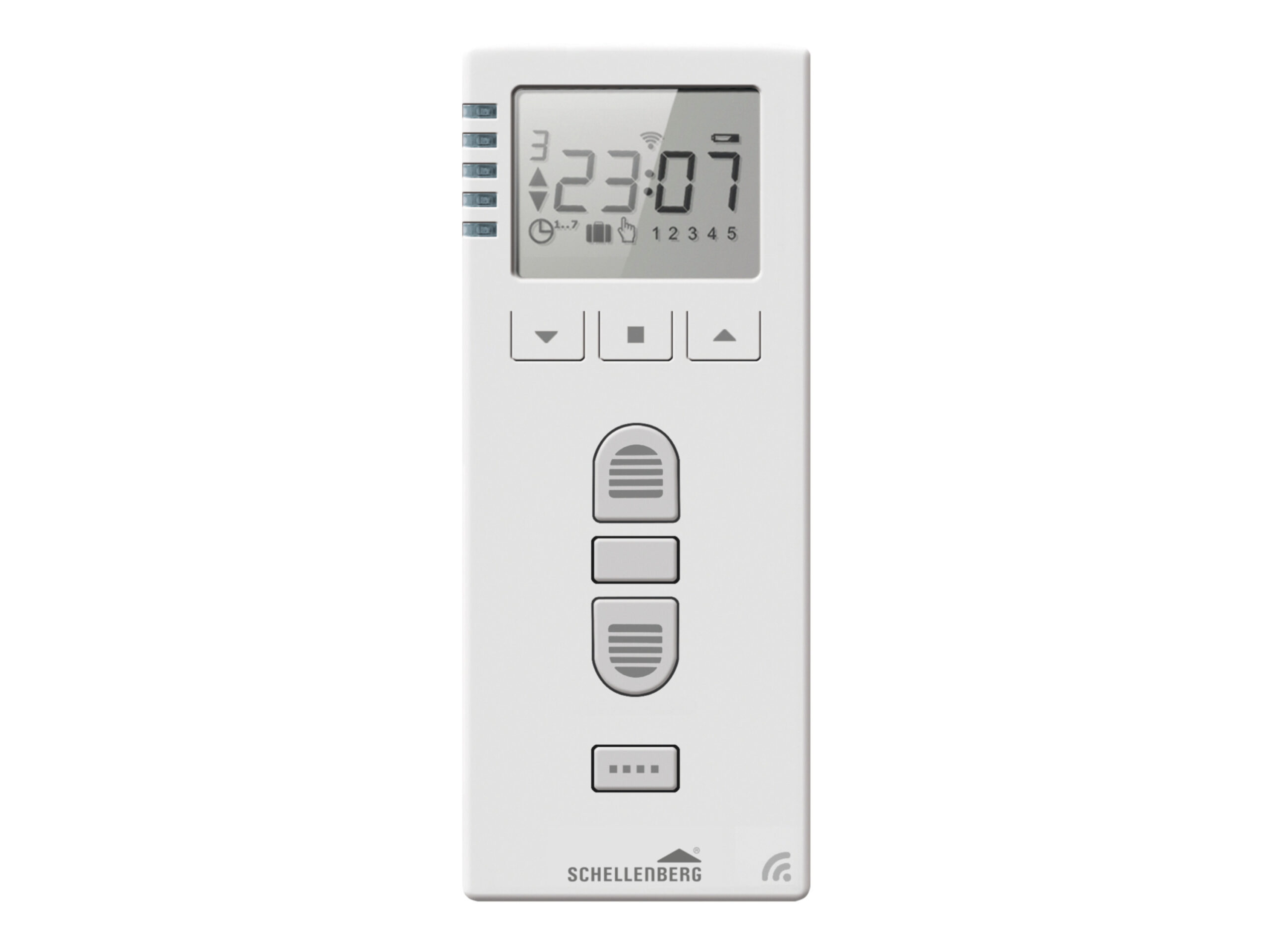 Funk-Zeitschaltuhr, Handsender und Wandschalter in einem Steuerung manuell per Funk oder nach individueller Zeitautomatik verschiedene Programme für automatische Zeitsteuerung gleichzeitige Steuerung von bis zu 25 Schellenberg Funk-Produkten einfache Entnahme aus der Wandhalterung zur Nutzung als Fernbedienung Produktmerkmale Maße Wandhalterung (B x H x T): 80 x 155 x 12 mm Maße Zeitschaltuhr (B x H x T): 50 x 125 x 17 mm Farbe: Weiß Betriebsspannung: 3 V DC Batterietyp: 2 x 1,5 V, Typ AAA Akku: Verwendung von Akkus ist möglich (1,2 V, Typ Aaa) Funkfrequenz: 868,4 MHz, Schellenberg Radio System Sendeleistung: max. 10 dBm Funkreichweite im Gebäude: bis zu 20 m Funkreichweite im Freifeld: bis zu 100 m Schutzart: IP 20, nur für trockene Räume Zulässiger Temperaturbereich: 0 °C bis +50 °C Receiverkategorie: 3 Montageart: Aufputz
