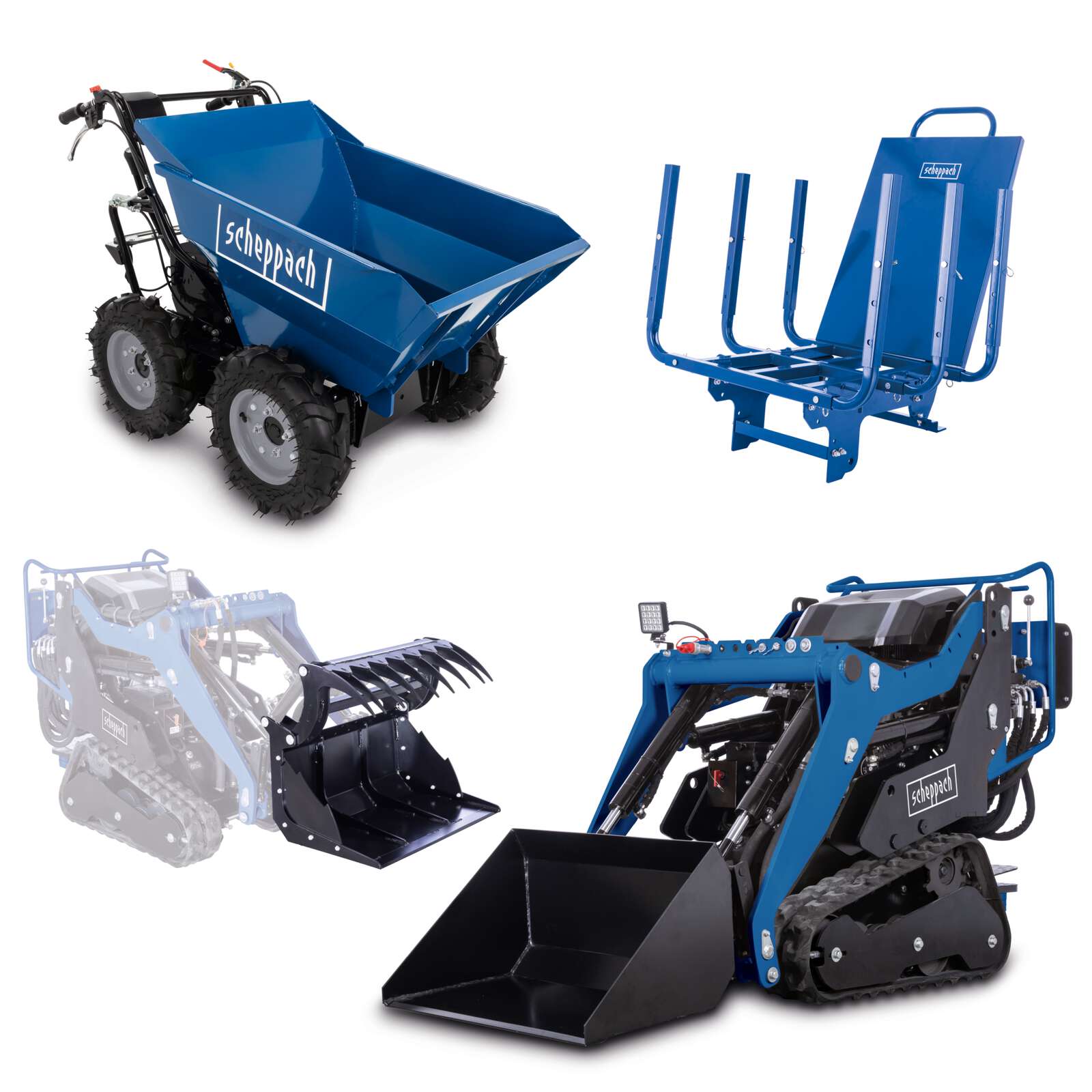 Der Scheppach Kompaktlader MKL730 ist mit maximal 200 kg Ladekapazität ein kraftvolles Multitalent für vielfältige Arbeiten rund um Garten, Hof oder Baustelle. Je nach Anbaugerät eignet sich der Kompaktlader zum Bohren von Erdlöchern, zum Verladen von Paletten, für Planier- und Schiebearbeiten oder zum Laden von Sand, Erde oder Gehölz. Das Raupenfahrwerk mit je 180 mm Kettenbreite sorgt für maximale Stabilität auch in unwegsamem Gelände. Dank seiner kompakten Bauweise und einer Spurbreite von nur 740 mm passt der MKL730 auch durch schmale Durchgänge und erreicht selbst schwer zugängliche Stellen problemlos. Ausgestattet mit einem leistungsstarken 8,5 PS / 6,3 kW 4-Takt-Benzinmotor mit 306 cm3 und einer präzisen Hydraulik ermöglicht er ein genaues Arbeiten auch in anspruchsvollen Umgebungen. Kraftvoller Kompaktlader mit 200 kg Ladekapazität für vielfältige Arbeiten im Garten, auf der Baustelle oder auf dem Hof Leistungsstarker 8,5 PS / 6,3 W 4-Takt-Benzinmotor mit 306 cm3 E-Start für ein einfaches Starten des Kompaktladers Spurbreite von 740 mm – ideal auch für schmale Durchgänge und zum Erreichen schwer zugänglicher Stellen Fahrgeschwindigkeit (vorwärts / rückwärts) max. 2,3 km/h Fahrerplattform mit Sicherheitsschalter und seitlichen Polsterauflagen für eine sichere Bedienung Hydraulische Schnellverschlüsse für einen einfachen Wechsel der separat erhältlichen Anbaugeräte Raupenfahrwerk mit einzeln steuerbaren Ketten mit je 180 mm Kettenbreite für maximale Stabilität auch in unwegsamem Gelände Einfache Steuerung über Bedienhebel Maximale Ladehöhe 2500 mm 32 kPa Bodenanpressdruck Doppel-Hydraulikpumpe mit 2x 15 L/min und ca. 29 L Tankvolumen Ösen zum Heben und Verzurren LED-Scheinwerfer sorgt für eine optimale Sicht Steigfähigkeit max. 25° Maximales Drehmoment 18,5 Nm Serienmäßig mit einer 80 L (0,08 cm3) Ladeschaufel für den alltäglichen Einsatz ausgestattet Umfangreiches Zubehör separat erhältlich inkl. Greifschaufel mit abnehmbaren Seite für Holzsstämme, Stroh etc. Dumper DP3000: Der Scheppach Dumper DP3000 ist der ideale Helfer für den Bau, in der Forst- und Landwirtschaft sowie für den Garten- und Landschaftsbau. Mit ihm können Erde, Kies, Steine, Schutt und vieles mehr mühelos transportiert werden. Dank der luftgefüllten Geländereifen und dem Allradantrieb findet der DP3000 auch in unebenem, schwer befahrbarem Gelände, auf rutschigem, glattem oder matschigem Untergrund ausreichend Halt. Die Steuerung der Fahrtrichtung, in drei Vorwärtsgängen und einem Rückwärtsgang, erfolgt komfortabel über den Handgriff. Ideal für das Bewegen von Lasten bis zu 300 kg Luftgefüllte Geländereifen und Allradantrieb für maximalen Halt Sehr gute Flexibilität und Manövrierbarkeit Großer Kippbehälter, ideal für feste und lose Transportgüter Fahrtrichtung am Handgriff steuerbar Getriebe – 3 Vorwärtsgänge und 1 Rückwärtsgang Kippbehälter – 912 x 650 x 560 mm inkl. Holzrunge Egal ob Erde, Kies oder Schutt – ein Dumper ist der ideale Helfer, sobald etwas Schweres transportiert werden muss. Auf dem Bau, in der Forst- und Landwirtschaft oder im Garten- und Landschaftsbau, der Scheppach Dumper DP3000 sorgt stets für müheloses Vorankommen – sogar auf glattem oder matschigem Untergrund. Mit seinem leistungsstarken 4,1 kW bzw. 5,6 PS 4-Takt-Benzinmotor kann der DP3000 Lasten bis zu 300 kg bewegen. Die luftgefüllten Geländereifen und der Allrandantrieb sorgen für maximalen Halt auf jedem Untergrund. Dank einer Spurbreite von 70 cm, bewerkstelligt der Muldenkipper auch Engstellen problemlos. Der große Kippbehälter misst 912 x 650 x 560 mm und ist ideal für feste und lose Transportgüter geeignet. Die Kippeinrichtung wird dabei per Hand bedient. Der DP3000 verfügt über ein Mehrgang-Getriebe mit drei Vorwärtsgängen und einem Rückwärtsgang. Dadurch lässt sich der Dumper flexibel manövrieren. Die Fahrtrichtung lässt sich ganz einfach am Handgriff steuern. Die Vorlaufgeschwindigkeit beträgt dabei maximal 6,4 km/h, die Rücklaufgeschwindigkeit 2 km/h. Unbeladen hat der Scheppach DP3000 ein Gewicht von 143 kg, dadurch ist er besonders stabil und kippsicher. Ein Schneeschild ist außerdem separat erhältlich, sodass der Muldenkipper bei Bedarf sogar als Schneeräumer eingesetzt werden kann.