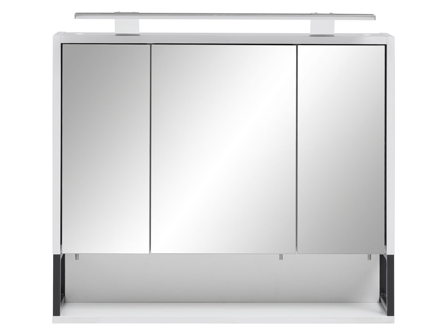 3-türiger Spiegelschrank 3 Glas-Einlegeböden (höhenverstellbar) Türen inkl. Anschlagdämpfung 1 offenes Fach Für den perfekten Rundumblick lassen die äußeren Türen sich jeweils nach innen öffnen Stiftgriff verschraubt an Türkante Hochwertige Metallbeschläge Rahmen in anthrazit lackiert aus Stahl Inkl. Schalter-/Steckdosenkombination Inkl. LED-Leuchte Einfache Montage mit verständlicher Aufbauanleitung Made in Germany Technische Daten Beleuchtung: LED-Aufbauleuchte Spannung im Betriebszustand: 220 – 240 Volt 9,6 Watt 470 Lumen Material Spanplatte + Spiegel Maße ca. B 70 x H 61,1 x T 16 cm Höhe inkl. Beleuchtung: ca. 68 cm Offenes Fach: ca. 66,9 x 14,4 x 13 cm Länge der Lampe: ca. 60 cm Gewicht ca. 18 kg Lieferumfang 1 x Schrank in Montagematerial und Aufbauanleitung