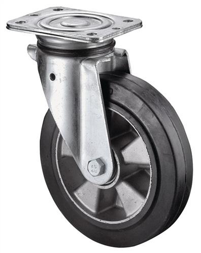 Schwerlastlenkrolle D.200mm Trgf.450kg Gum.138mm 110mm · Tragfähigkeit bis 450 kg · stabiles Stahlblechgehäuse, verzinkt chromatiert · zweireihiger Kugelkranz im Gabelkopf · Elastik-Vollgummireifen (schwarz, fest aufvulkanisiert) auf Aluminium-Radkörper · Radachse verschraubt · Kugellager · mit Plattenbefestigung · Weitere technische Eigenschaften Oberfläche Gehäuse: verzinkt-chromatiert · Schraubloch-Ø: 11mm · Ausladung: 52mm · Schraublochentfernung: 105 x 75mm · Material Gehäuse: Stahlblech