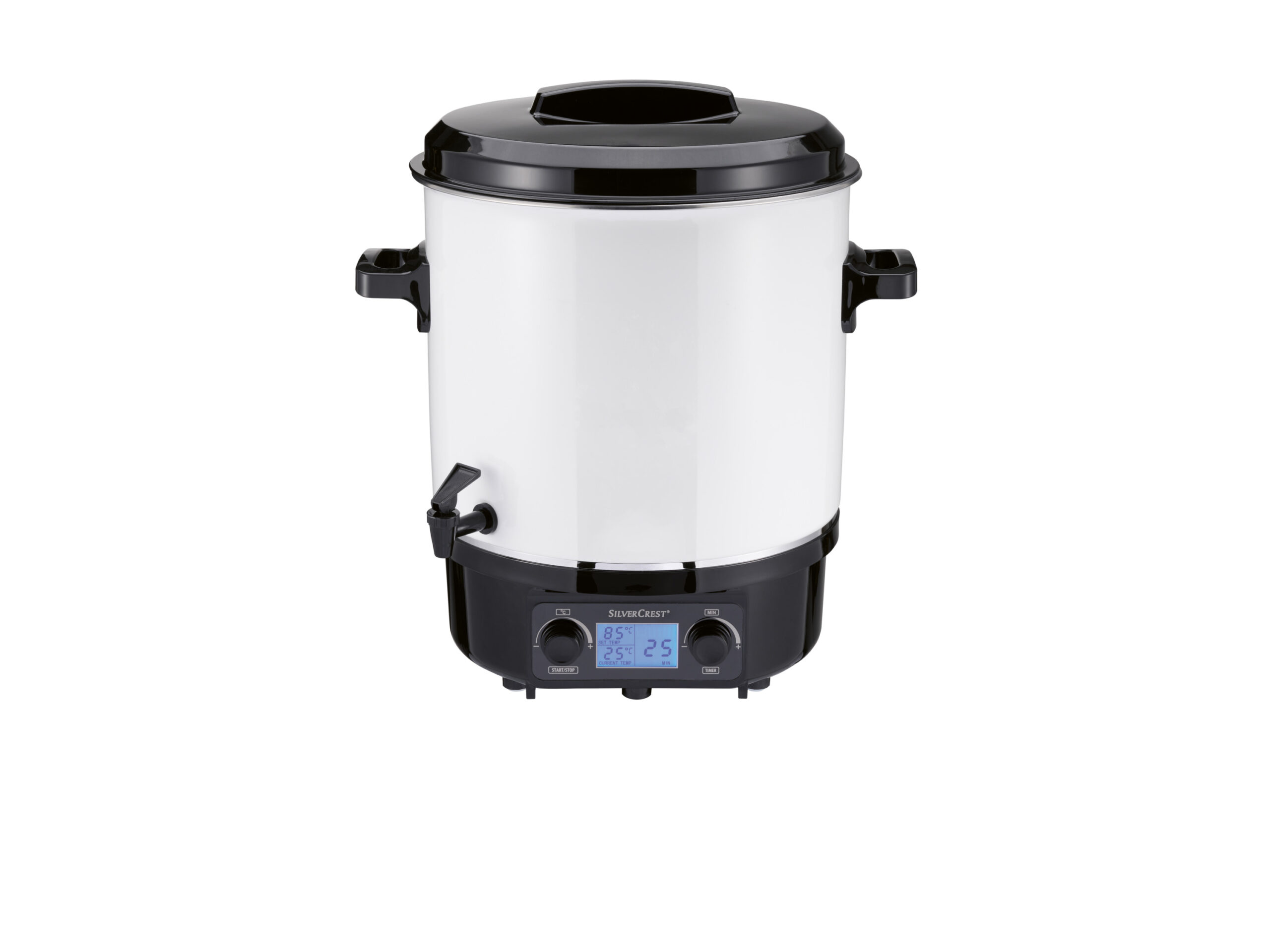Zum Einkochen und Konservieren von Marmelade, Obst und Gemüse Auch zum Erwärmen und Warmhalten von Getränken; Eintöpfen; Suppen und anderen Speisen Mit digitalem Display und elektronischer Steuerung Für bis zu 14 Einkochgläser in 2 Lagen – inkl. Einkochgitter Emailliertes Gehäuse und wärmeisolierte Griffe Integrierter Zapfhahn z. B. für Punsch Großer Kessel mit bis zu 24 l Nutzvolumen Variable Temperatureinstellung von 30-100 °C Timerfunktion Überhitzungsschutz Signalton beim Erreichen der Zieltemperatur bzw. Ablauf der eingestellten Kochdauer Digitale Anzeige von aktueller und voreingestellter Temperatur sowie Restlaufzeit Kabelaufwicklung und Antirutschfüße Leistungsaufnahme: 1800 W Nutzvolumen: bis zu 24 l Zeiteinstellung: 1-120 min Kabellänge: 110 cm Material Kunststoff, Stahl Maße ca. 46,5 x 37 x 48 cm Gewicht ca. 5,8 kg Lieferumfang 1x Einkochautomat, 1x Einlegegitter, 1x Deckel, 1x Basis, 1x Behälter ohne Griffe, 1x Behälter mit Griffen