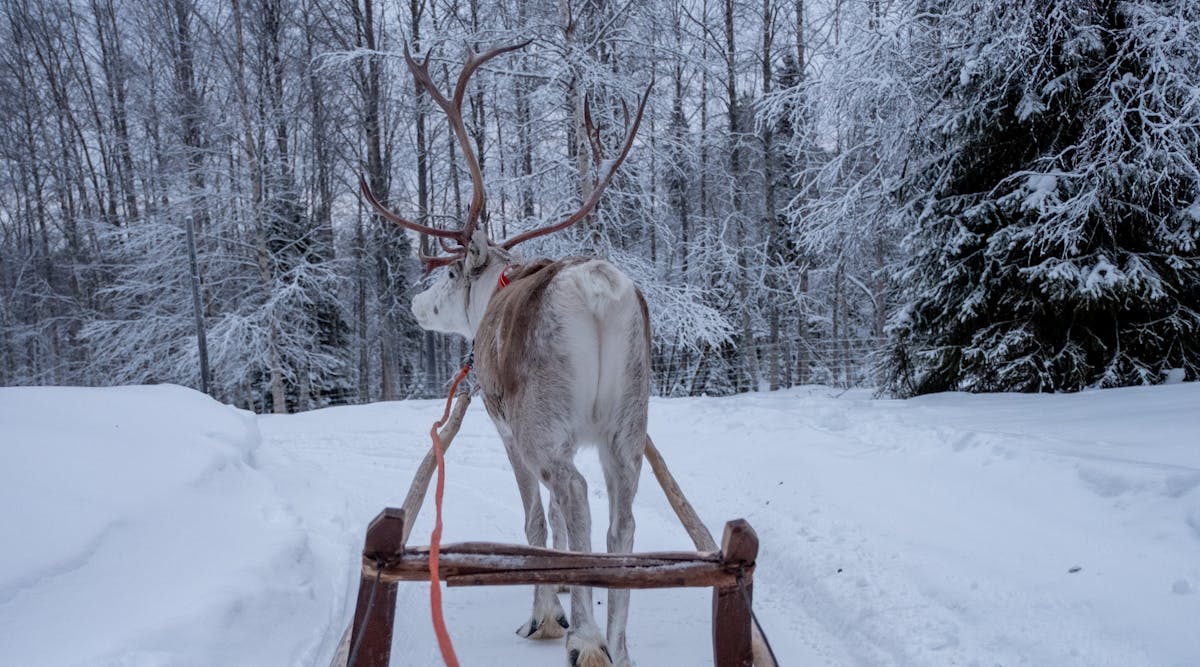 Tauchen Sie ein in die Natur und lassen Sie Ihre Sorgen los, während Sie auf einen Schlitten steigen und eine Fahrt mit Rentieren im finnischen Lappland unternehmen.