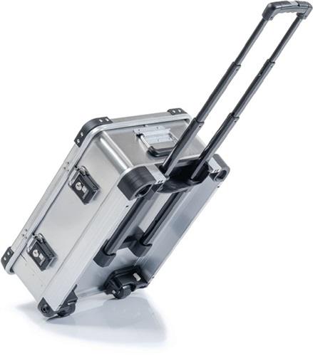 Transportbox Außen-L550xB400xH233mm 28l Alu.m.Stapelecken · aus hochwertigem Aluminium · integrierten Rollen Ø 50 mm aus Polyurethan und Polyamid · mit herausziehbarem Teleskopgriff · Deckel mit zwei Gurtbändern · hochbelastbarer Federfallgriff · Stabi