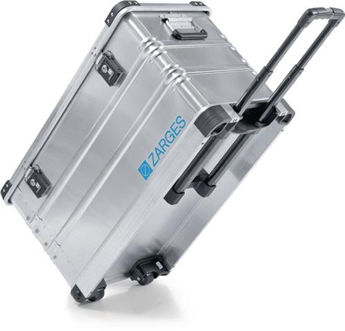 Transportbox Außen-L800xB400xH455mm 99l Alu.m.Stapelecken · aus hochwertigem Aluminium · integrierten Rollen Ø 50 mm aus Polyurethan und Polyamid · mit herausziehbarem Teleskopgriff · Deckel mit zwei Gurtbändern · hochbelastbarer Federfallgriff · Stabi