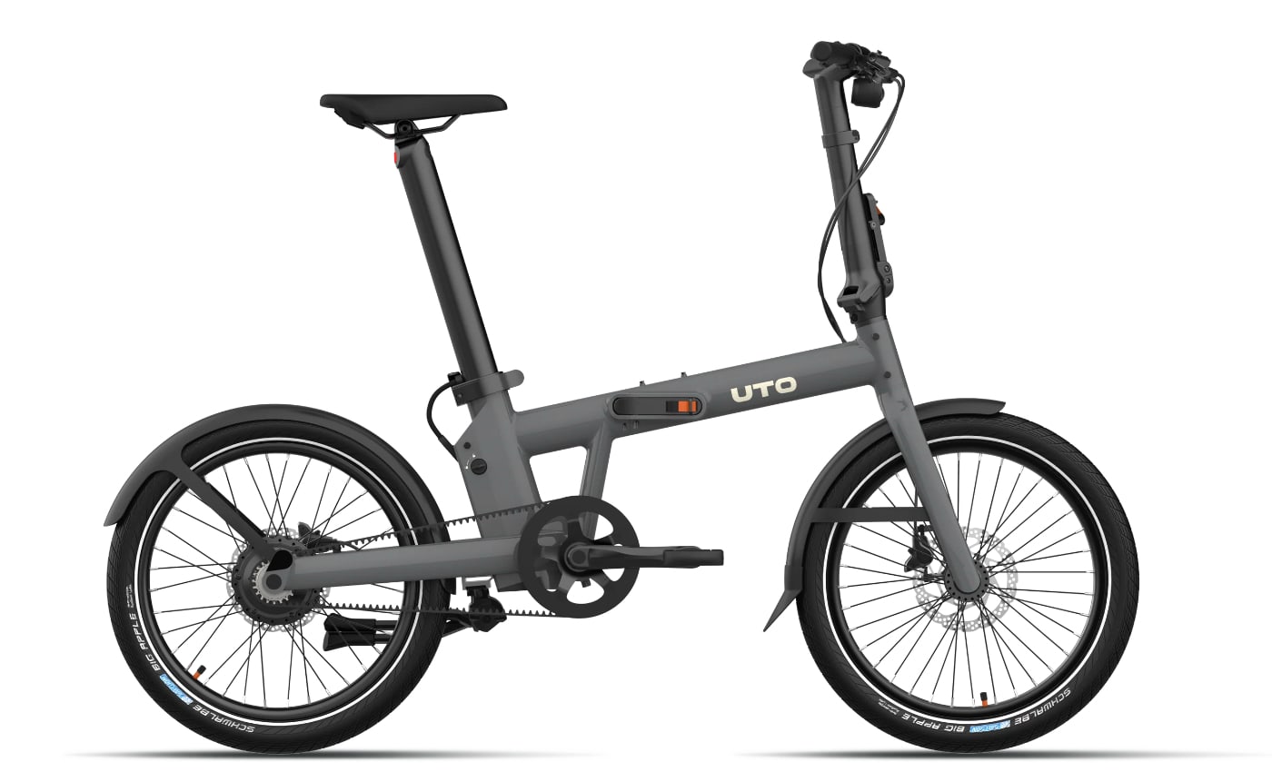 UTO PRO20 – anthrazitgrau Das UTO PRO20 in anthrazitgrau ist die elegante 20-Zoll-Variante des vielfach ausgezeichneten Faltrads. Mit seiner Kombination aus kraftvollem Motor, wartungsfreiem Riemenantrieb und durchdachtem Design ist es der ideale Begleiter für Alltag, Pendelstrecken und Wochenendtouren. Elektrisch, faltbar und vielseitig Der Bafang Dual Speed Nabenmotor (250 W, 40 Nm, entspricht 85 Nm Mittelmotor) bietet zusammen mit dem Drehmomentsensor eine harmonische, reaktionsschnelle Unterstützung. Die automatische Gangschaltung übernimmt das Schalten vollständig für dich – präzise und unabhängig vom Akkustand. So genießt du jederzeit ein gleichmäßiges, müheloses Fahrgefühl. Sauber, leise und wartungsarm Dank des Gates CDN-Riemenantriebs bleibt deine Kleidung sauber und die Wartung minimal. Kein Öl, kein Rost – nur flüssiges, lautloses Fahren. Ergänzt wird das System durch hydraulische Shimano MT200 Scheibenbremsen für höchste Sicherheit und Kontrolle auf jeder Strecke. Komfortabel und durchdacht Das UTO PRO20 überzeugt mit ergonomisch geformtem Lenker und Griffsystem für eine natürliche Handhaltung. Die speziell gestalteten Griffe passen sich perfekt an Handfläche und Finger an und sorgen für maximalen Komfort auf längeren Fahrten. Mit einem Gewicht von nur 21 kg (inkl. Akku) und einem kompakten Faltmaß von 86 × 69,5 × 46 cm ist das Bike ideal für intermodales Reisen, den Transport im Kofferraum oder die platzsparende Aufbewahrung zu Hause. Motor: Bafang Dual Speed Nabenmotor, 250 W, 40 Nm (entspricht 85 Nm Mittelmotor) Akku: Samsung 36 V, 9,8 Ah, 352,8 Wh – Reichweite bis zu 70 km Ladezeit: ca. 4-5 Stunden Schaltung: Automatisches, mechanisches System Antrieb: Gates CDN Riemenantrieb Bremsen: Hydraulische Scheibenbremsen Shimano MT200 Rahmen: Aluminium mit glatten Schweißnähten, interne Kabelführung Reifen: Schwalbe Big Apple 20×2,15″, pannensicher mit Reflexstreifen Frontlicht: Litemove 70 Lux, automatisch Rücklicht: Litemove, automatisch Gewicht: ca. 21 kg (inkl. Akku) Faltmaß: 86 × 69,5 × 46 cm Körpergröße: 1,45 – 1,95 m Max. Zuladung: 130 kg Das UTO PRO20 in anthrazitgrau bietet maximale Flexibilität und Komfort – perfekt für alle, die stilvoll, sauber und effizient unterwegs sein möchten. Video: The Award-Winning Electric Folding Bike: PRO20 (formerly Afternoon PRO)