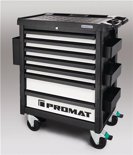 Wkz.wagen PROFI B790xT480xH1035mm 650 kg 7 Schubl.Stahlbl.PROMAT · mit 7 auf kugelgelagerten Teleskopschienen herausziehbaren Schubladen mit 100 % Auszug mit jeweils einer Antirutschmatte · automatischer Schubladeneinzug · Schubladensicherheitsystem verhindert selbstständiges Öffnen der Schubladen · mit Zentralverriegelung (nur eine Schublade gleichzeitg geöffnet) · Einteilerset für 4 Schubladen im Lieferumfang enthalten · abschließbar mittels eingebauten Zylinderschloss mit 4 Schlüsseln · beidseitiges Lochwandsystem (9 x 9 mm) für einfache Installation von Zubehörartikel · durchgezogener Kantenschutz · hochwertige PVC Rollen · 4 lenkbare Rollen · 2 davon können starr gestellt werden · inkl. Bremsfunktion an allen 4 Rollen · robuste Ablagefläche aus Polypropylen mit Ablagefächer für Kleinteile und Lochung für Laptophalterung (nicht im Lieferumfang enthalten) · aus Stahlblech Maß über alles aufgebaut mit Griff und Rädern (B x T x H) 790 x 480 x 1035 mm Maß nur Korpus (B x T x H) 678 x 459 x 859 mm Innenmaß Schubladen (B x T x H) 5 x 568 x 398 x 75 mm Innenmaß Schubladen (B x T x H) 2 x 568 x 398 x 154 mm Tragkraft pro Schublade 40 kg / statische Gesamtbelastbarkeit 650 kg · Ausstattung: 3 x Dosenhalter mit Lochung für Schraubendreher 1 x Abfallbehälter 1 x Papierrollenhalter